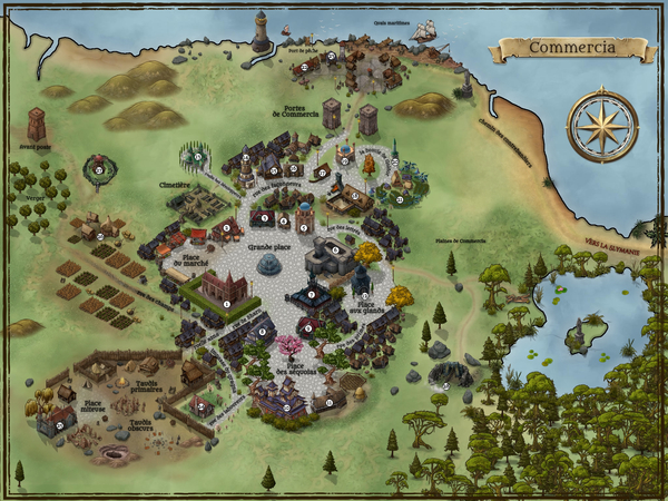 La ville est divisée en plusieurs secteurs : un secteur commercial, ou l'on peut vagabonder dans le petites rues et trouver son bonheur. Un secteur défavorisé, où traînent brigands sans logis et sans argent, et enfin un secteur touristique, où tavernes, auberges, et gîtes vous proposent mets, bières et nuits dorées. D'ailleurs, quand vous passerez à Commercia, allez à la Taverne de Kwarik, ça vaut le détour !